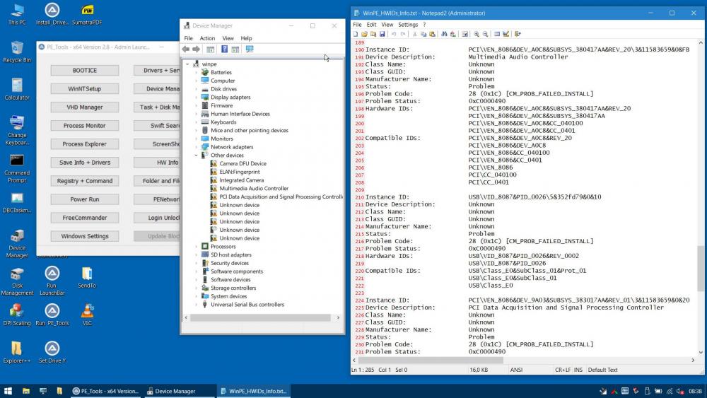PE_Tools version 2.8 with Portable Apps for WinPE - After booting with PE_*.wim file - Save Info gives HWIDs for Missing Drivers collected in file WinPE_HWIDs_Info.txt in folder PE_Tools\Drivers_Info 1. Run Install_Drivers_from_Export_Folder.exe on PE Desktop 2. Select Drivers Export subfolder e.g. System, MEDIA Or Net 3. pnputil.exe is auto used to Install non-Microsoft Drivers as earlier Exported by WinNTSetup Install_Drivers_from_Export_Folder.exe is used to Install Missing System and MEDIA Drivers - Audio OK -